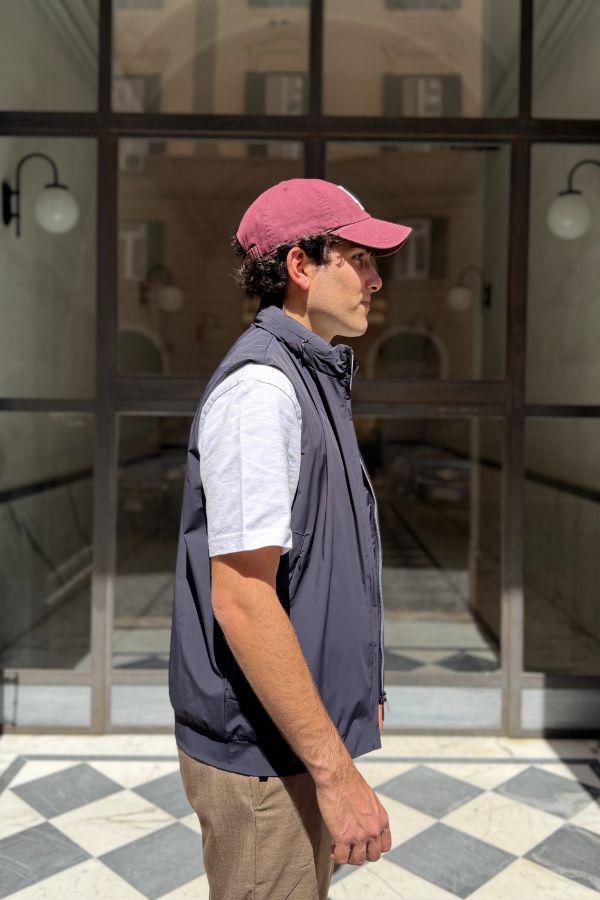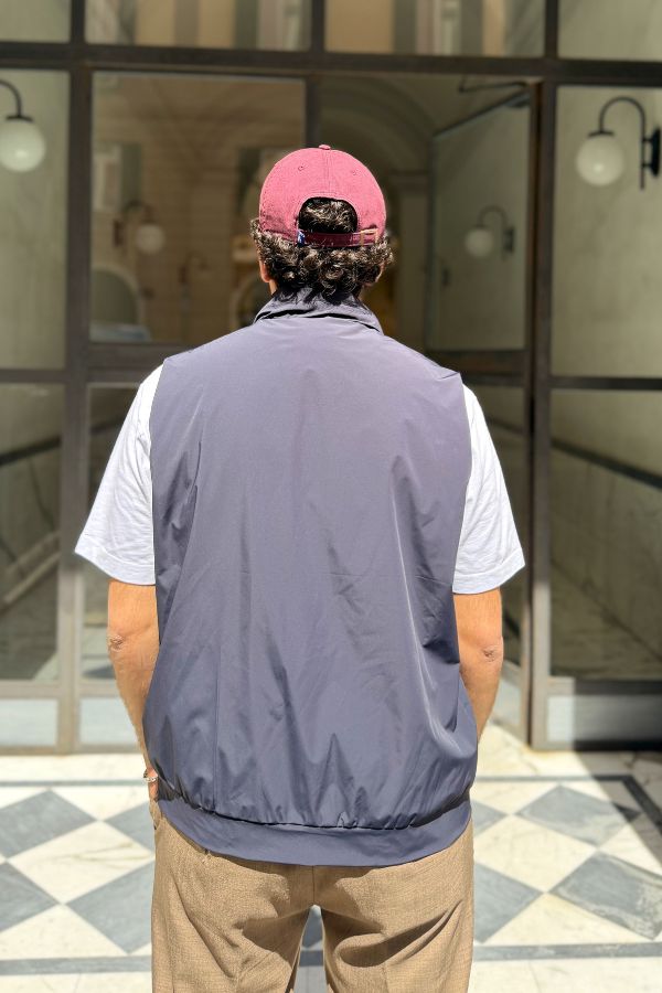 Gilet impermeabile in tessuto tecnico blu navy, pensato per l'uomo che non rinuncia allo stile anche nelle giornate più fresche. Dotato di doppio cursore per una vestibilità personalizzabile e di una pratica pochette integrata che permette di riporlo facilmente. Collo alto con zip, tasche laterali. Leggero, compatto e versatile